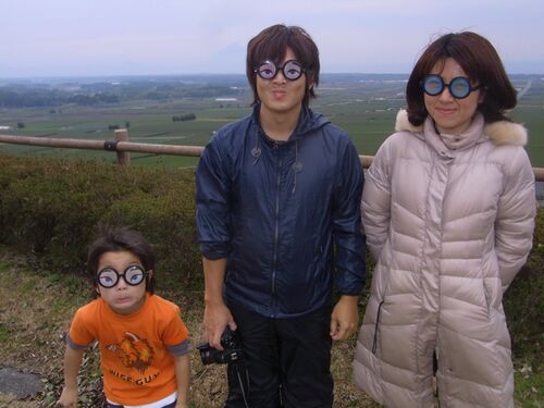 先の日記のつづき。磯遊びの帰り。 開聞岳が見下ろせる展望台で記念撮影。 この日は天気が悪く、眺めはすったり。かろうじて目を凝らすとぼやけた開聞岳が見える?かな?皆さん、のりがいいのだ。だから、何をやっても楽しいのだ。ね。