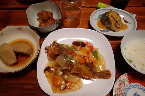 9月1日から4日まで対馬出張。 前半は比田勝中心。 民泊「たちばな」に3泊させてもらった。いつも居心地がいい。 食事を紹介。 アラカブのから揚げに甘酢餡がかかっている。とっても美味。 刺身。ヒラス(ヒラマサの子供)とカツオ。それにサバ。何という…