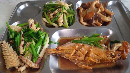 5月18日。 5月18日から22日の昼食を紹介。 5月18日。イカとにらの炒め物も美味しかった。魚はカワハギの仲間。美味しかった。 5月19日。 魚の煮つけ。 卵とウリの炒め物。意外とおいしい。 5月20日。カキフライ。右上の肉は羊。カレー風味でとっても…